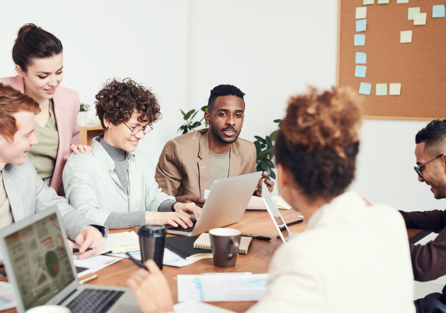 Diverse team around a table with laptops, engaging in collaborative problem-solving and strategic intelligence.